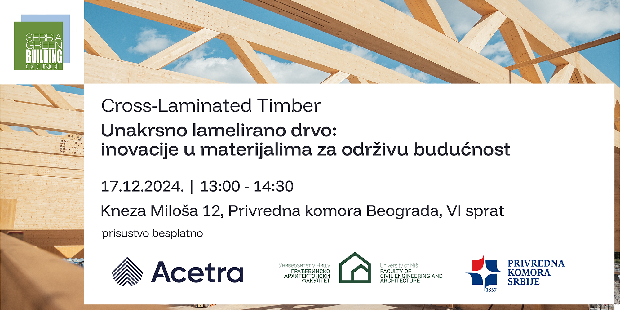 Savet zelene gradnje Srbije vas poziva da nam se pridružite na besplatnom predavanju 17. decembra od 13:00 u prostorijama Privredne komore Beograda u Kneza Miloša 12, VI sprat i saznajte sve o ekološkim svojstvima ovog materijala, njegovom fleksibilnom dizajnu, prefabrikovanoj gradnji koja gotovo ne proizvodi otpad na gradilištu, cirkularnosti i svemu ostalom zbog čega se CLT ističe kada je reč o održivosti.
