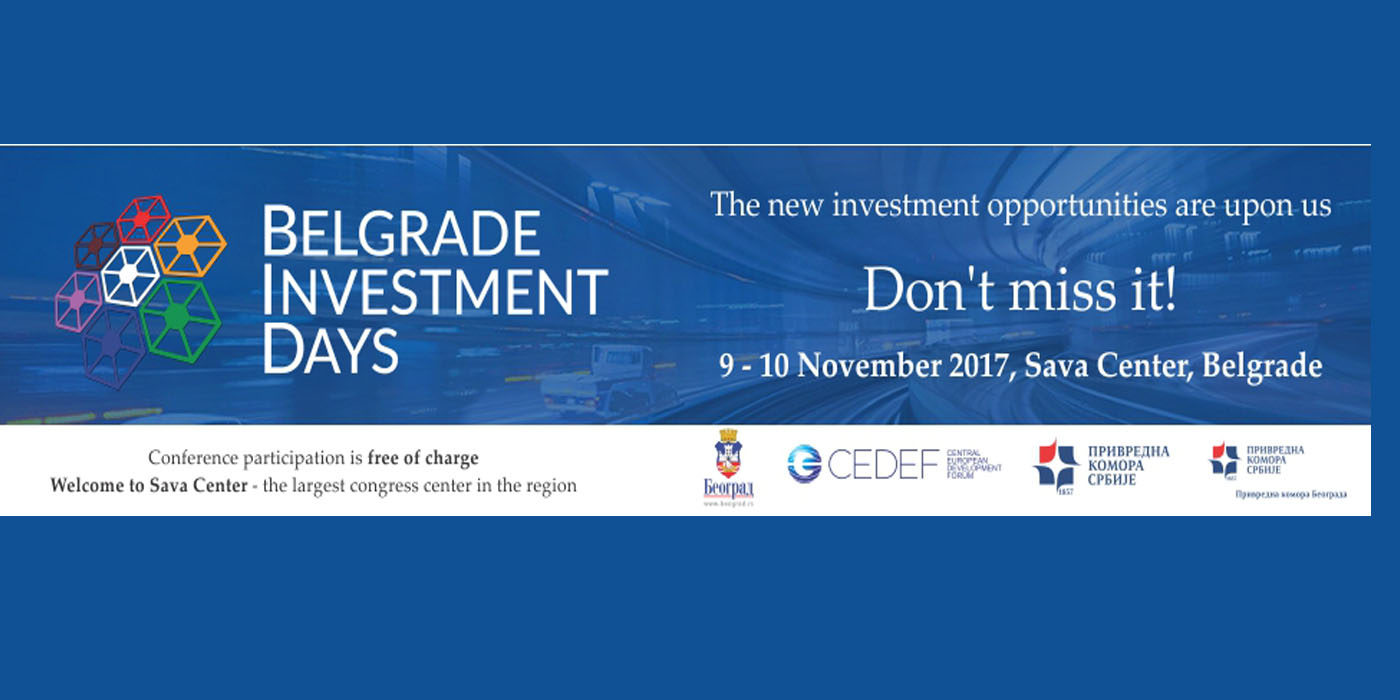Nakon uspešno organizovanih Beogradskih investicionih dana 2015. i 2016 godine, treći po redu Beogradski investicioni dani će biti održani 9. i 10. novembra 2017. godine u organizaciji Grada Beograda, Centralno evropskog foruma za razvoj CEDEF, Privredne komore Srbije i Privredne komore Beograda. Ovaj značajan skup je mesto susreta državnika iz zemlje i regiona, lidera i predstavnika domaćih i stranih kompanija, državnih institucija, lokalnih samouprava, diplomatskih tela i međunarodnih institucija i organizacija. Posebna pažnja i fokus svih dešavanja tokom Beogradskih investicionih dana 2017. biće na regionalnoj saradnji.